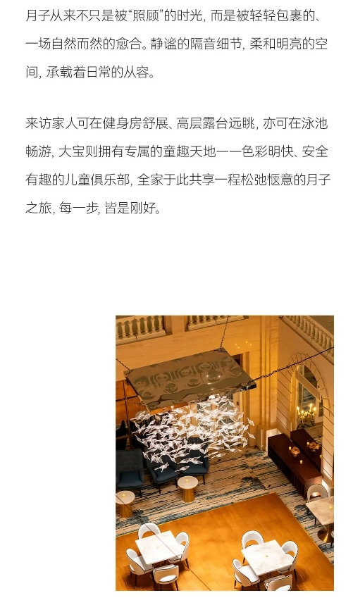 来访家人可在健身房舒展、高层露台远眺,亦可在泳池畅游,大宝则拥有专属的童趣天地-一色彩明快、安全有趣的儿童俱乐部,全家于此共享一程松弛惬意的月子之旅,每一步, 皆是刚好。