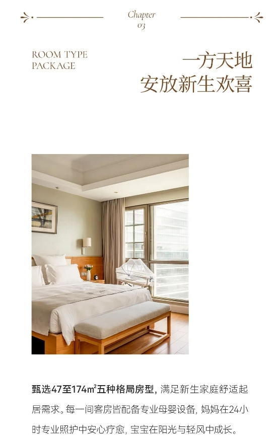 甄选47至174m五种格局房型,满足新生家庭舒适起居需求。每一间客房皆配备专业母婴设备,妈妈在24小时专业照护中安心疗愈,宝宝在阳光与轻风中成长。