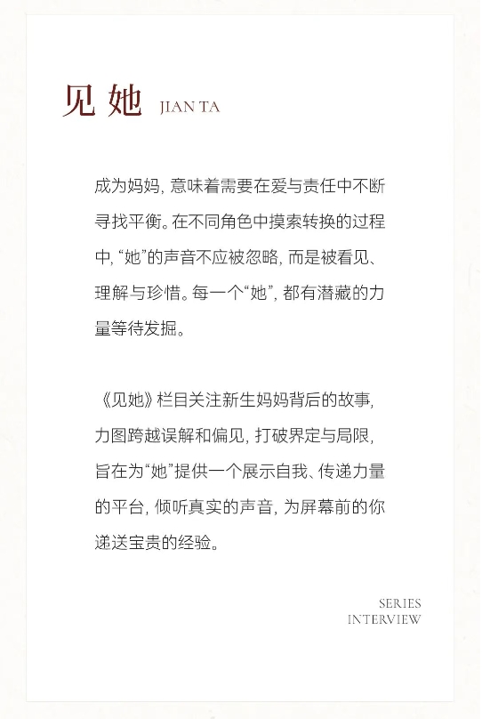 《见她》栏目关注新生妈妈背后的故事力图跨越误解和偏见,打破界定与局限旨在为“她”提供一个展示自我、传递力量的平台,倾听真实的声音,为屏幕前的你递送宝贵的经验。