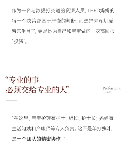 作为一名与数据打交道的资深人员,THEO妈妈的每一个决策都基于严谨的判断。而选择来深圳爱帝宫坐月子,更是她为自己和宝宝做的一次高回报“投资”。