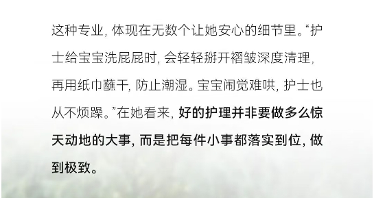这种专业,体现在无数个让她安心的细节里。“护士给宝宝洗屁屁时,会轻轻掰开褶皱深度清理再用纸巾蘸干,防止潮湿。宝宝闹觉难哄,护士也从不烦躁。”在她看来,好的护理并非要做多么惊天动地的大事,而是把每件小事都落实到位,做到极致。