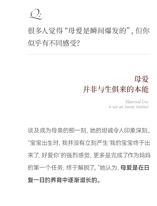 谈及成为母亲的那一刻,她的坦诚令人印象深刻:宝宝出生时,我并没有立刻产生“我的宝宝终于出来了,好爱你’的强烈感觉,更多是完成了作为妈妈的第一个任务,终于解脱了。”她认为,母爱是在日复一日的养育中逐渐滋长的。