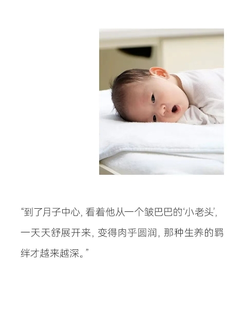 “到了月子中心,看着他从一个皱巴巴的'小老头一天天舒展开来,变得肉乎圆润,那种生养的羁绊才越来越深。