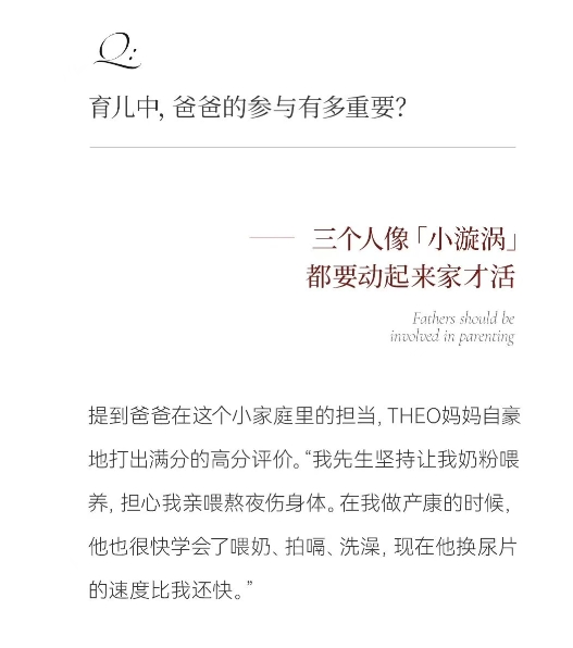 提到爸爸在这个小家庭里的担当,THEO妈妈自豪地打出满分的高分评价。“我先生坚持让我奶粉喂养,担心我亲喂熬夜伤身体。在我做产康的时候他也很快学会了喂奶、拍嗝、洗澡,现在他换尿片的速度比我还快。