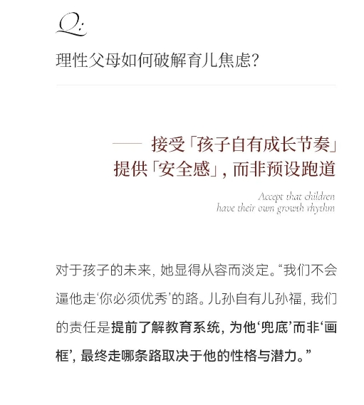 对于孩子的未来,她显得从容而淡定。“我们不会逼他走'你必须优秀’的路。儿孙自有儿孙福,我们的责任是提前了解教育系统,为他'兜底’而非'画框’最终走哪条路取决于他的性格与潜力。